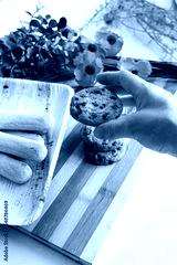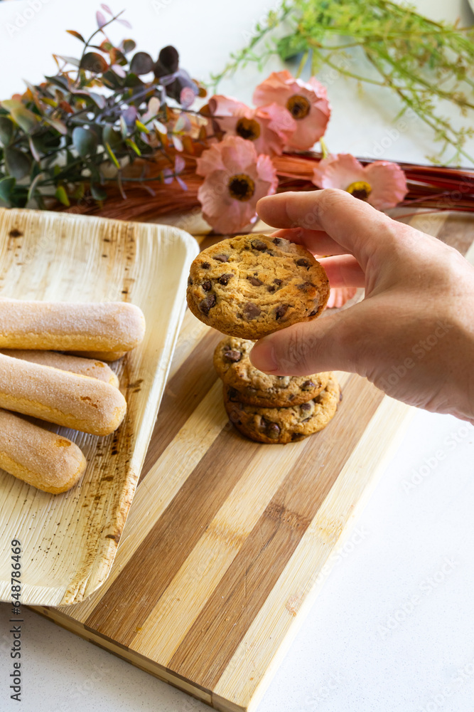 Woman's hand holding a homemade cookie with chocolate chips from a decorated table