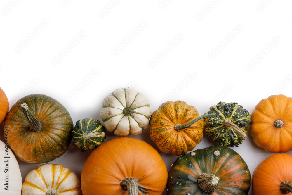 Autumn frame of pumpkins on white