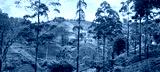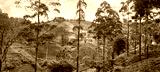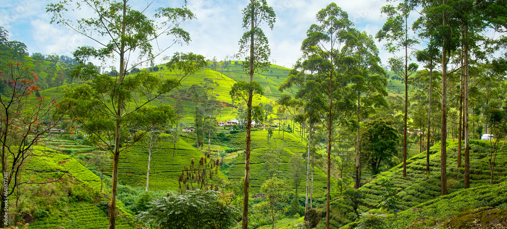 Tea plantation on the mountain slopes. Sri Lanka. Wide photo.