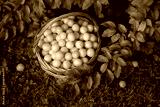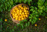 A wicker basket full of plums stands under a tree in the garden.Collecting summer fruits and berries. A yellow variety of plum.