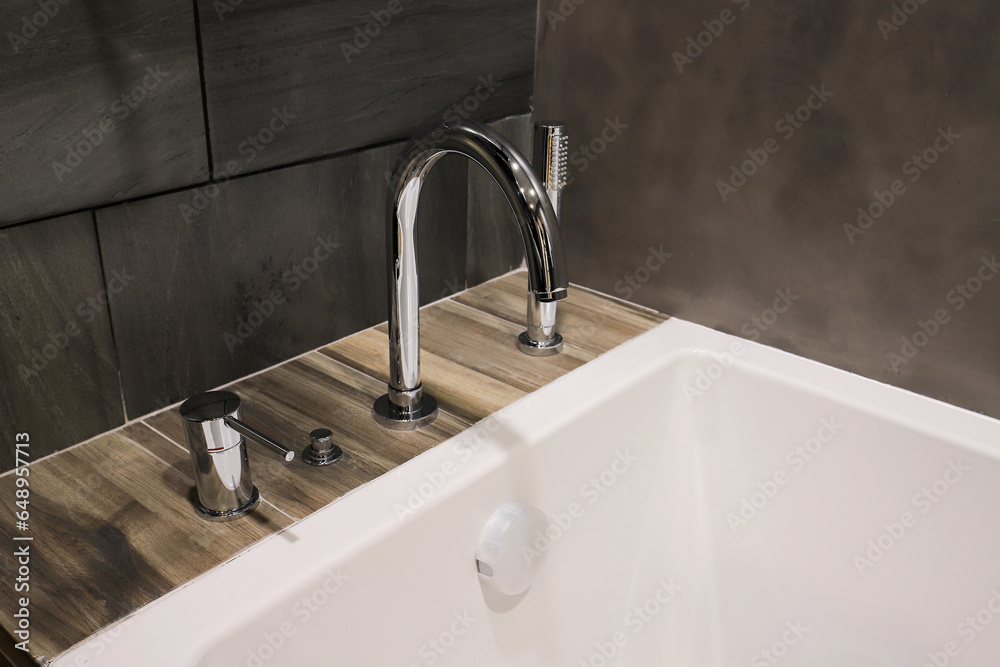Faucet with shower head close-up over bathtub