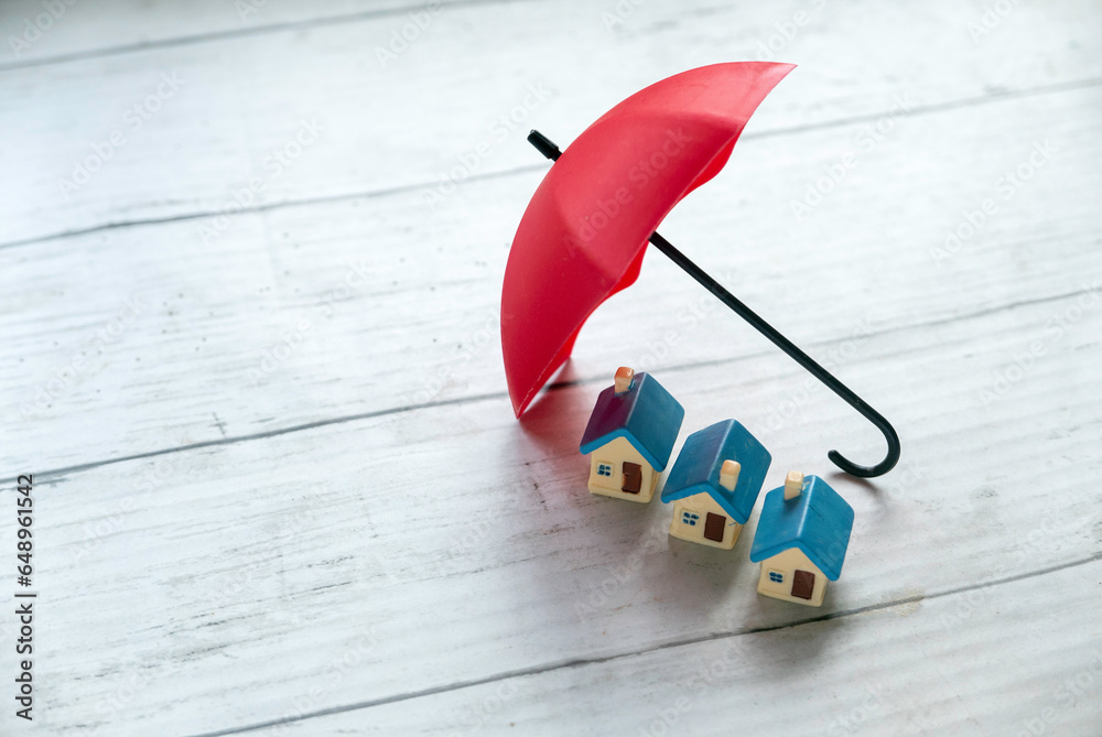 Concept of renters home insurance or mortgage protection. House under a red umbrella.