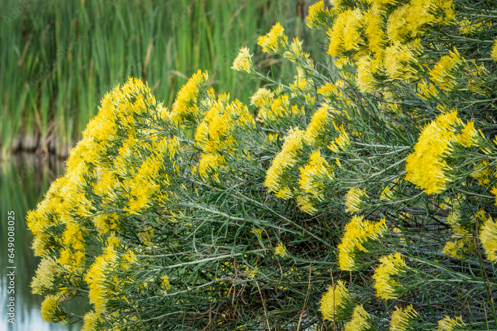 yellow flowers of rabbitbrush on lake shore in middle of September in Colorado