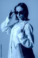 Fashionable young woman wearing trendy blue sunglasses, oversized white linen shirt, carrying straw wicker bag, posing on blue background