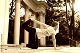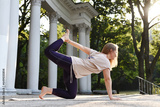 Woman practicing yoga position in the morning in park outdoors. Healthy lifestyle with active exercise and training.