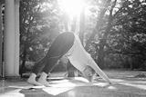 Young sporty woman practicing yoga, doing downward facing dog exercise, pose, wearing sportswear, workout in park outdoors.