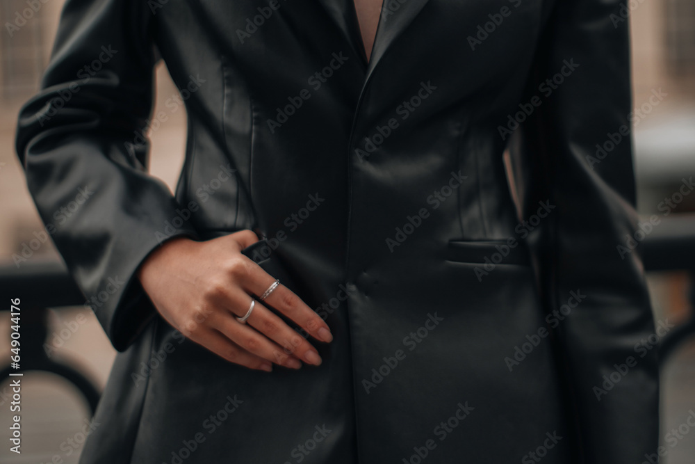 Fashion details of a black leather jacket with pockets and female hands with silver rings accessories. Fancy outfit, female accessories