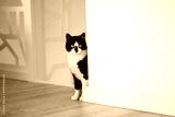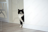 A black and white cat sits near a white wall in an apartment