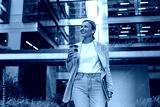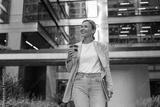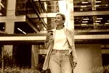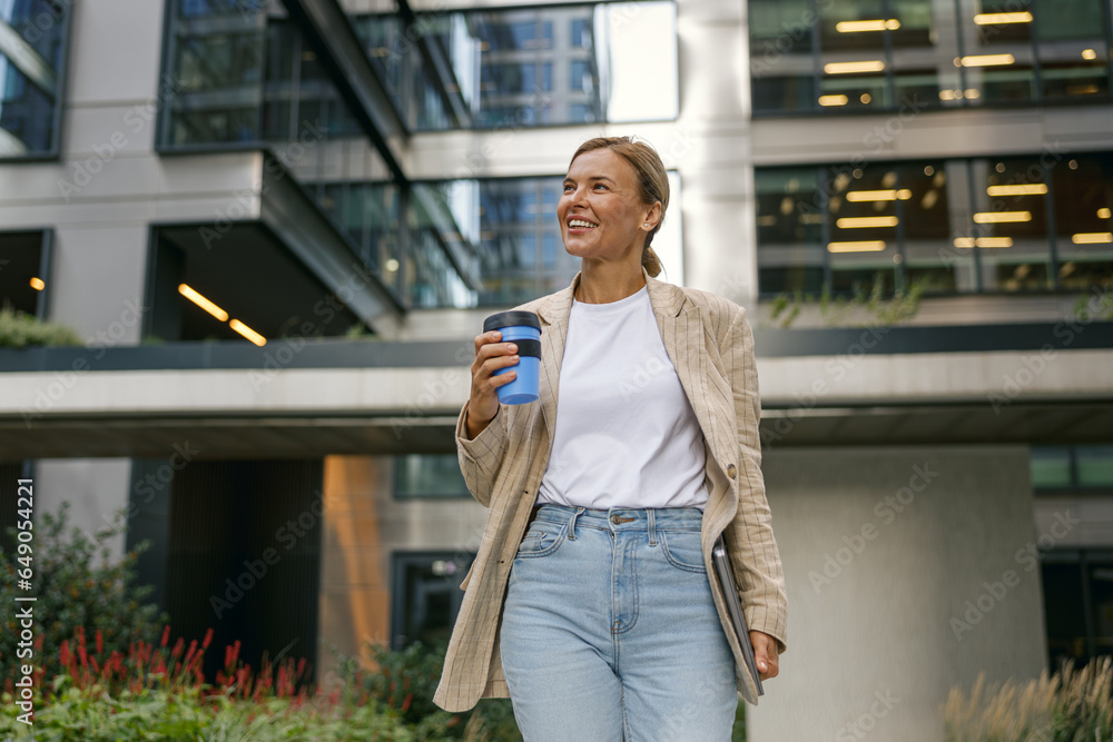 Positive female manager drinking coffee during break time near office building. High quality photo