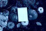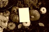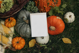 Autumn stationery outdoor still life. Blank greeting card, invitation mockup. Pumpkins, corns and grapes fruit on grass in sunlight. Moody fall garden harvest composition. Thanksgiving holiday concept