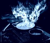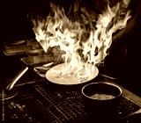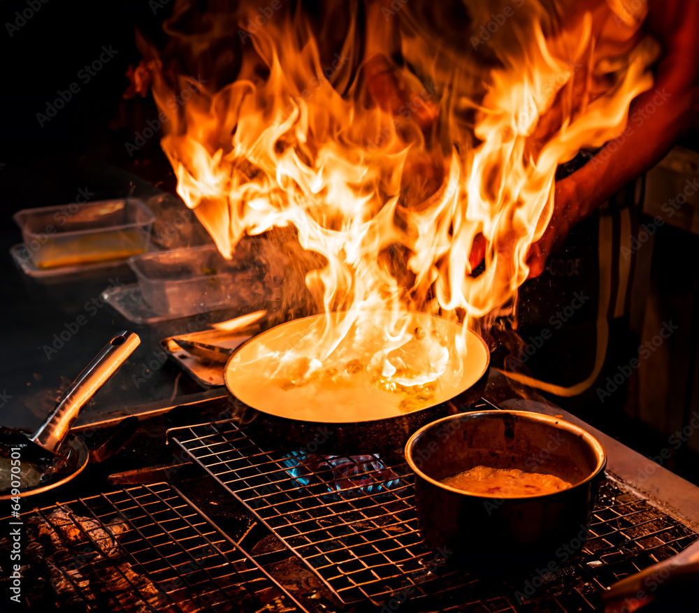 Chef cooking with flame in a frying pan on a kitchen stove.