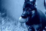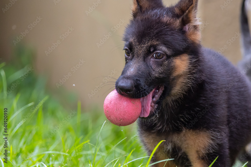 Adorable and cute playful German Shepherd Puppy playing ball on garden