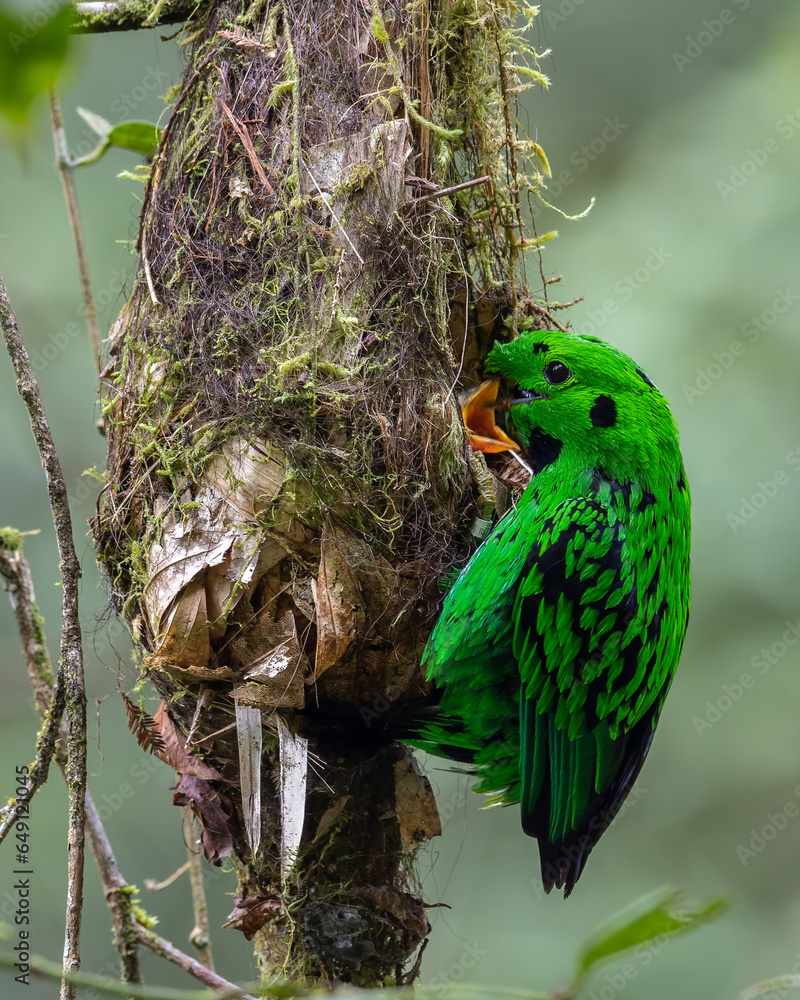 Nature wildlife image of Whitehead's Broadbill bird feeding small chick bird on bird nest. Whitehead's Broadbill bird endemic of Borneo