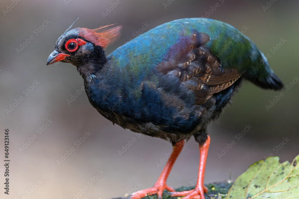 Nature wildlife portrait image of crested partridge (Rollulus rouloul) also known as the crested wood partridge, roul-roul, red-crowned wood partridge on deep forest jungle.