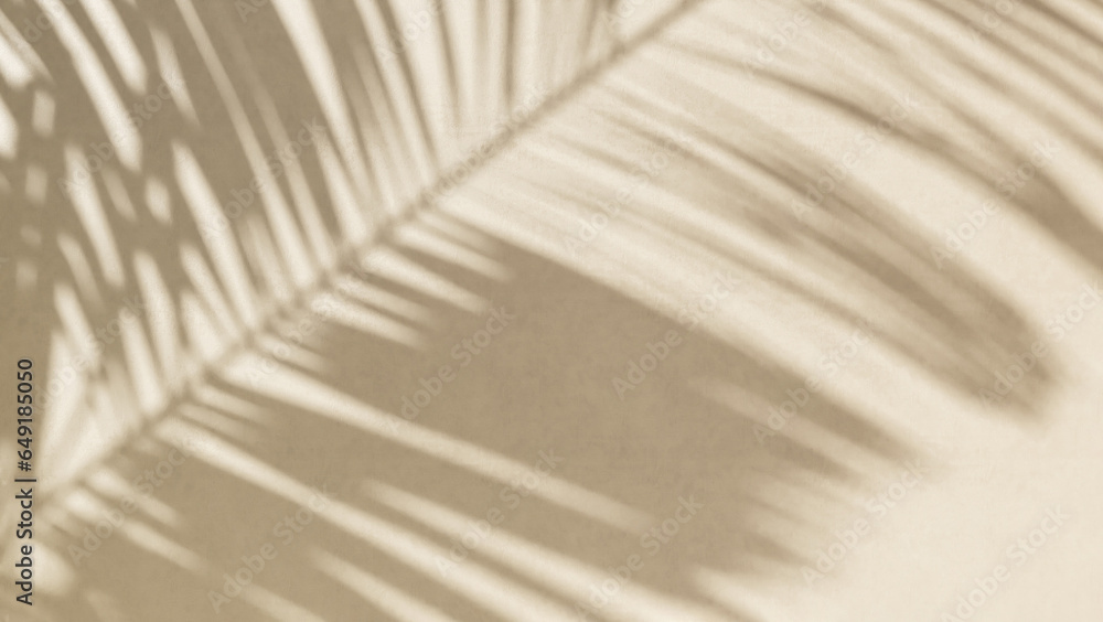 Tropical palm tree in sunlight with leaf shadow on blank beige brown cement texture wall for luxury beauty, fashion, cosmetic, skincare, body care, interior design decoration background 3D