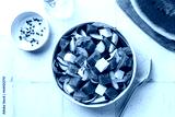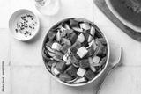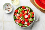 Top view of Fresh summer salad with watermelon, arugula, feta, cucumber salad, healthy food eating. White table background, copy space.
