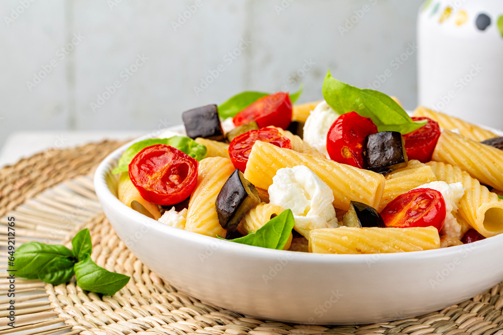Close-up of Italian pasta rigatoni with roasted eggplant, cherry tomato, mozzarella bufala cheese and basil leaves.