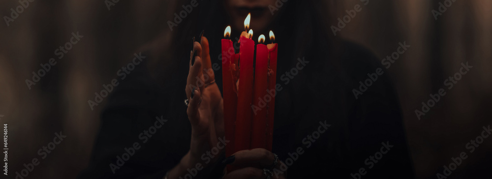 frightening witch performs an occult ritual with candles in a gloomy dark forest. Panoramic wide horizontal photo for banner head cover