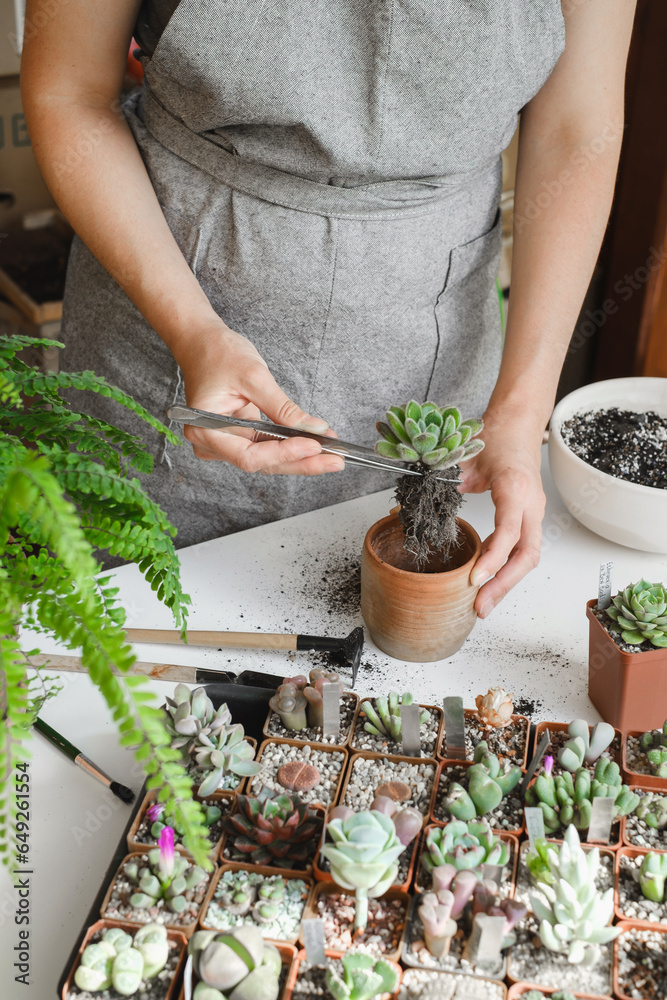 Repotting plant concept. Woman hands repotting succulent house plant. Plant roots in soil with gardening stylish tools, ground, drainage and clay pots. Home gardening calming hobby. Closeup