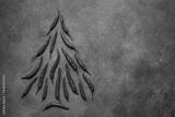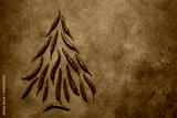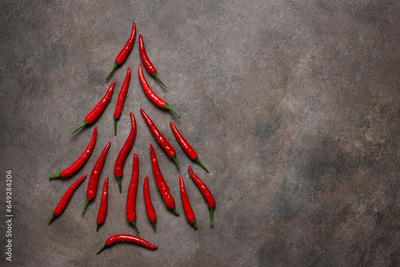 Chili pepper pods in the shape of a Christmas tree on a brown rustic background. Abstract Christmas tree. Top view, flat lay, copy space.