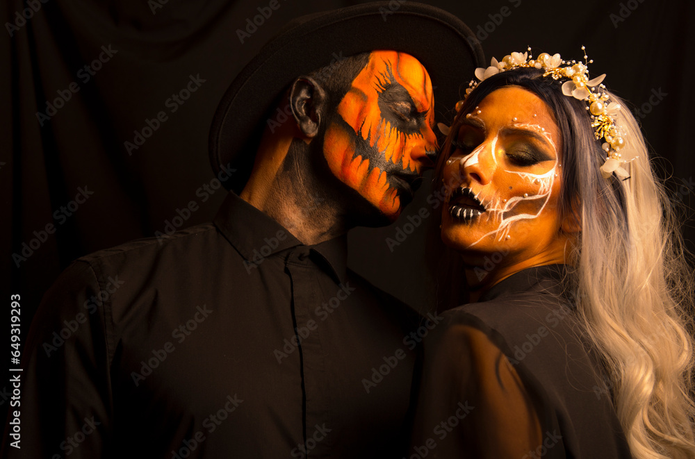 Couple with dark skull makeup on black background. Halloween face art. Adult. Couple in love.