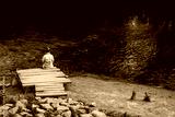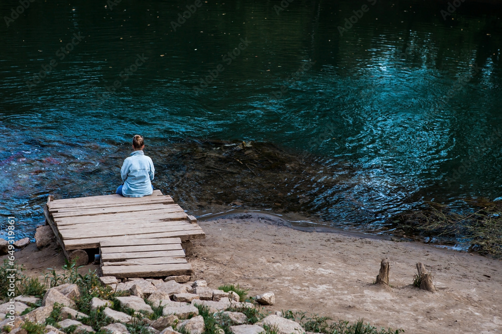 A girl is sitting on the shore of a blue lake. Beautiful natural background. Blue Lake in Kazan. Russia, Republic of Tatarstan, Kazan, September 2023