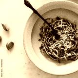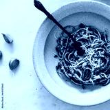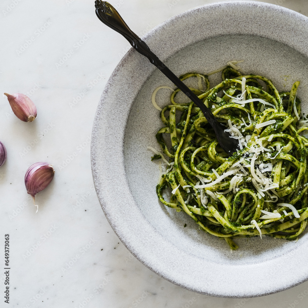 Plate of linguine pasta with greens and Parmesan cheese, healthy vegetarian meal, close up