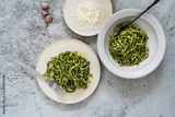 Plate of linguine pasta with greens and Parmesan cheese, healthy vegetarian meal