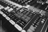 Sound mixer or concert sound engineer, closeup studio motorized volume level control sliders stero split channel device