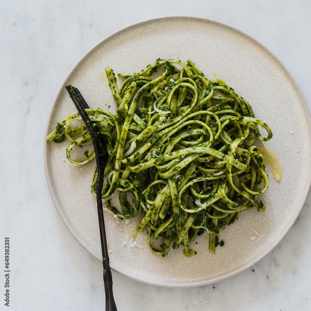 Plate of linguine pasta with greens and Parmesan cheese, healthy vegetarian meal, close up