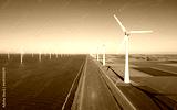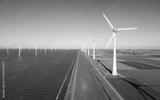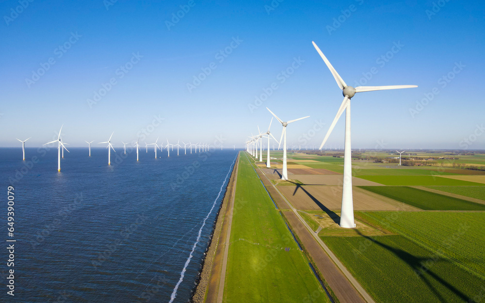 Turbine Green Energy Electricity, Windmill for electric power production, Wind turbines generating electricity on a green agricultural field in the Netherlands by the lake Ijsselmeer