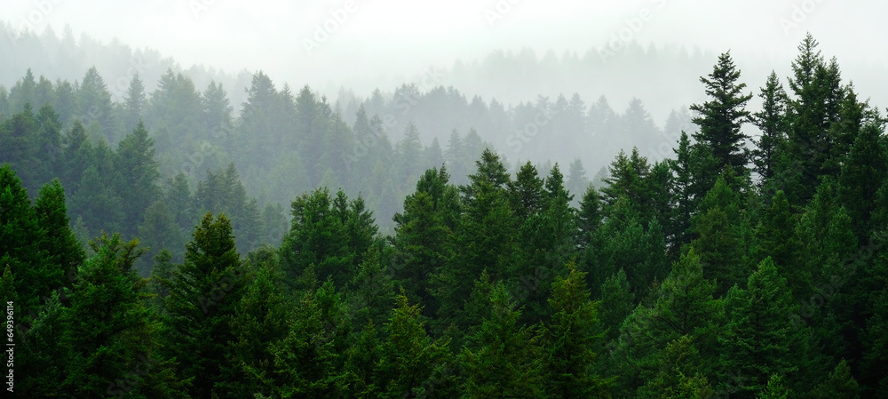 Rainy Lush Green Pine Tree Forest Forrest in Wilderness Mountains
