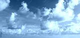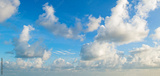 Blue sky and cumulus clouds. Wide photo.
