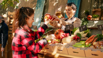 Vegetarian client choosing colorful apples and products, looking at organic produce on farmers market stall. Woman business owner selling fresh seasonal fruits and veggies at festival.