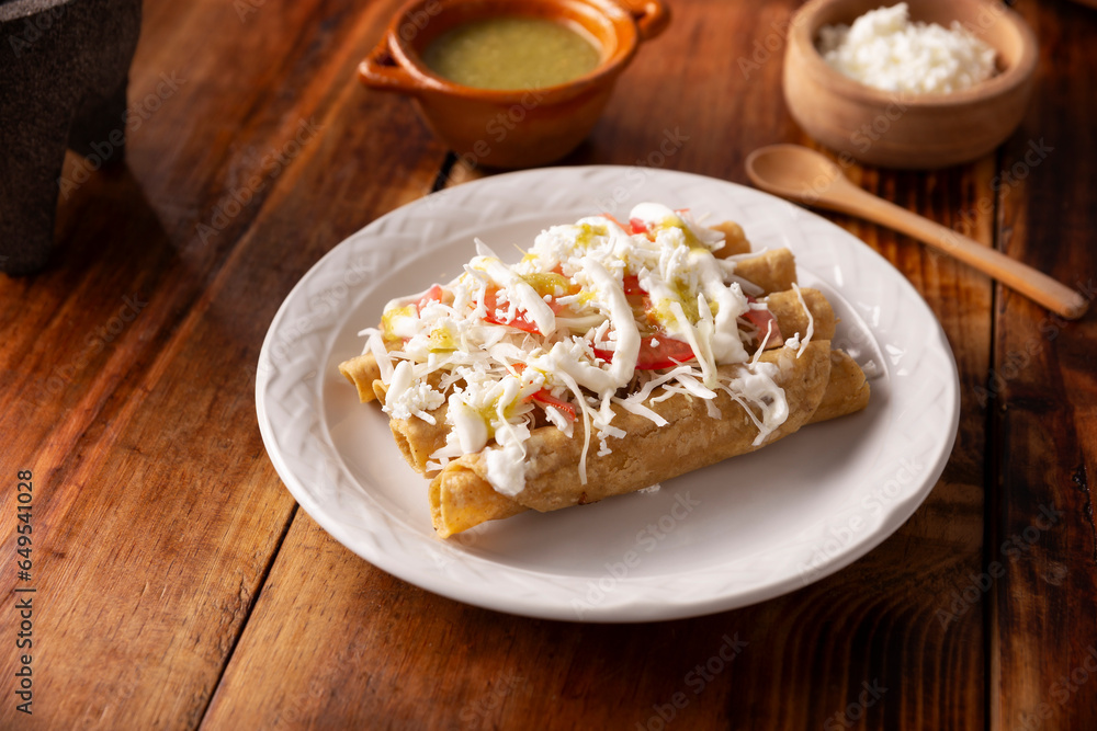 Tacos Dorados. Mexican dish also known as Flautas, consists of a rolled corn tortilla with some filling, commonly chicken or beef or vegetarian options such as potatoes.