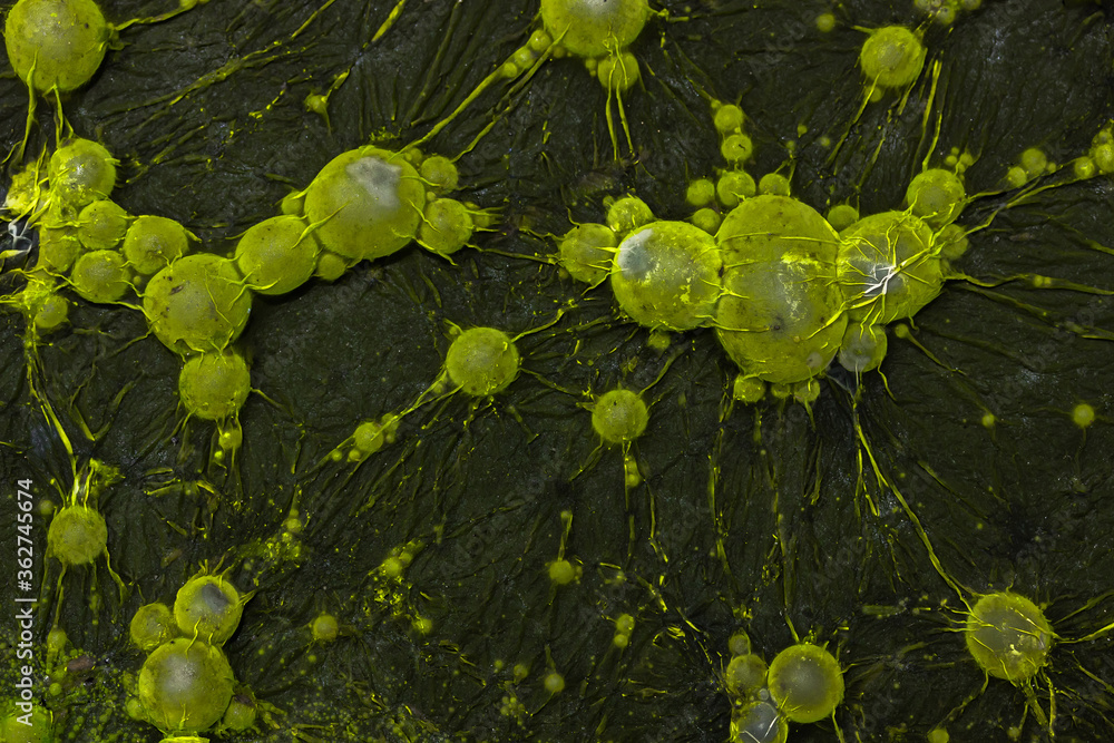 Dropper bottle with CBD oil, pipette and capsules near cannabis leaves close up, hard shadows