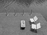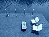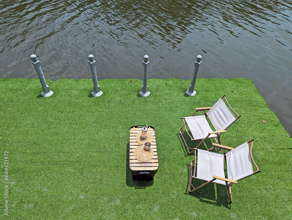 High angle view looking down on a riverside terrace with a pair of empty camping chairs and coffee table with jug on a carpet of green artificial grass. No people.