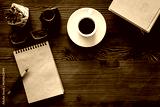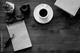 Home office author. Working space with books an notepad, top view