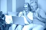 Video call concept. Happy bonding loving middle aged senior retired couple sitting on sofa, using laptop technology for online webcam connection, enjoying carefree moments together with distant family