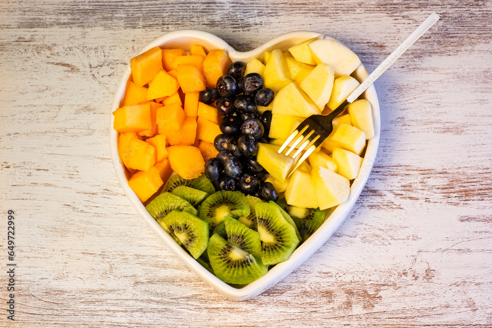 Closeup on a ready to eat fruit salad inside a heart shape bowl, cut kiwi, melon, apple and blueberries. Healthy eating concept.