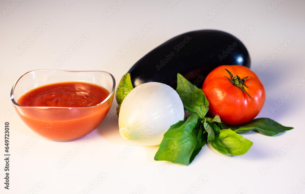 Ingredients on white table for making Italian pasta alla norma, traditional recipe with tomato, eggplant and onion. Healthy eating, Mediterranean diet
