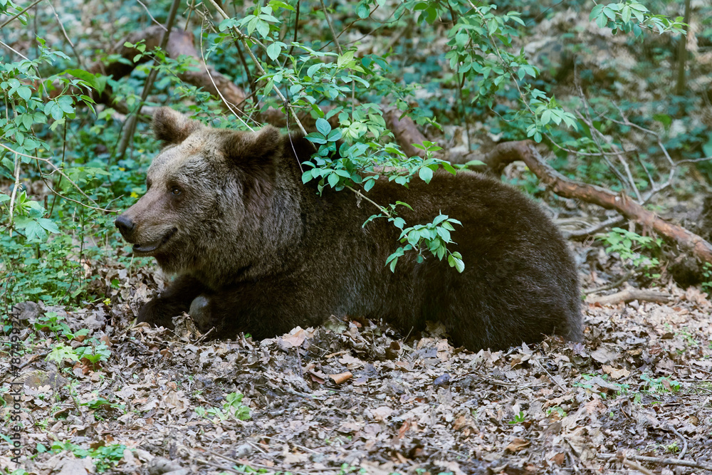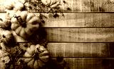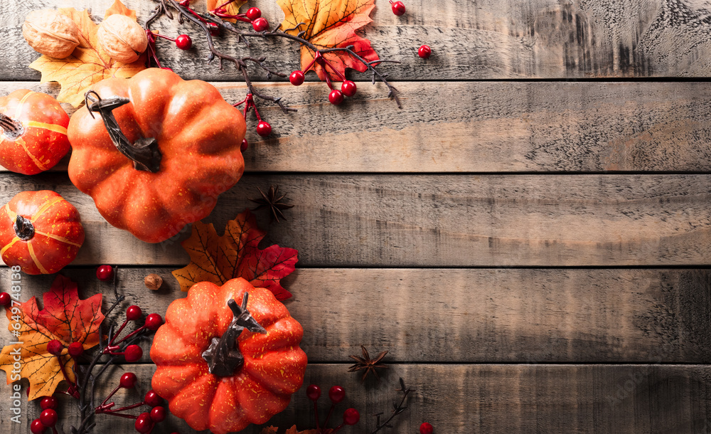 Autumn and thanksgiving decoration concept made from autumn leaves and pumpkin on dark wooden background. Flat lay, top view with copy space.