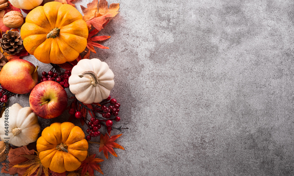 Thanksgiving and Autumn decoration concept made from autumn leaves and pumpkin on stone background. Flat lay, top view with copy space.
