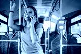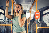 Travel, smartphone and woman on a bus or public transportation talking on the mobile, social media, online news or city website information.
