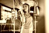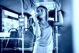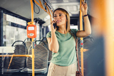 Beautiful young Caucasian woman who see a smart phone in city bus. Beautiful woman standing in city bus and using the phone. Businesswoman commuting to work by bus and working with a smartphone.