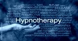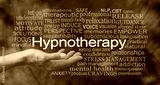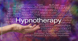 Offering you a Hypnotherapy service word cloud - female with open palm hand and the word HYPNOTHERAPY above surrounded by relevant word cloud on a modern abstract background