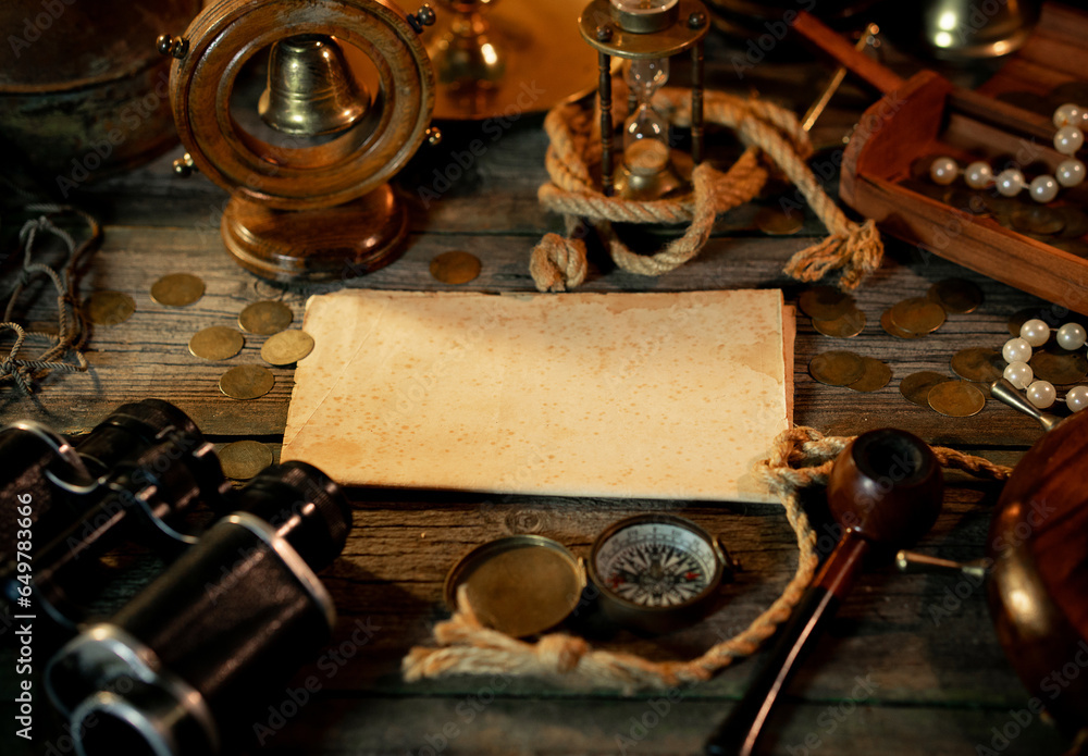 Treasure island concept on a wooden table background. Sheet of paper for text or map