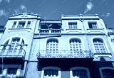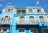 Street view of the facade of an old colonial building, Quito, Ecuador.