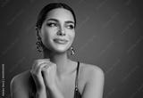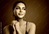 Beauty Model Portrait with plump Lip Makeup looking sideways. Beautiful smiling Woman with smooth Face Skin Make up and Golden Earrings over brown. Dermal Filler