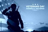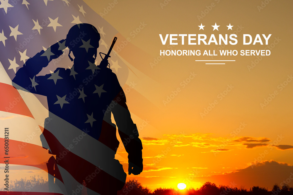 Silhouette of soldier with USA flag against the sunset. Greeting card for Veterans Day, Memorial Day, Independence Day